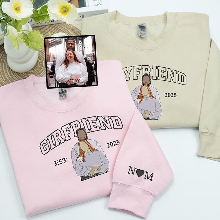 🧵 カップル写真刺繍フーディー | パーソナライズされた彼と彼女のスウェットシャツ | カップル向け記念日ギフト