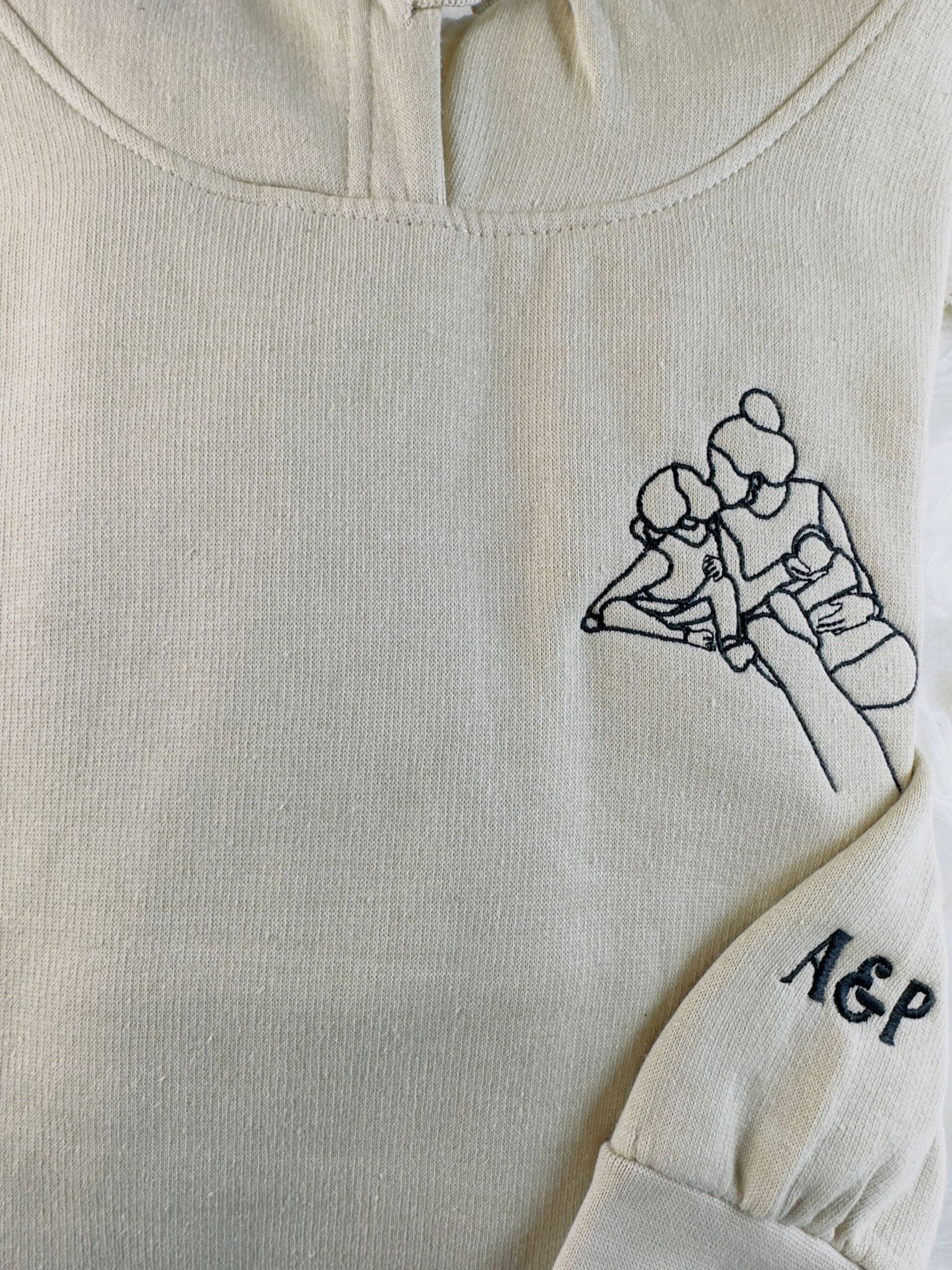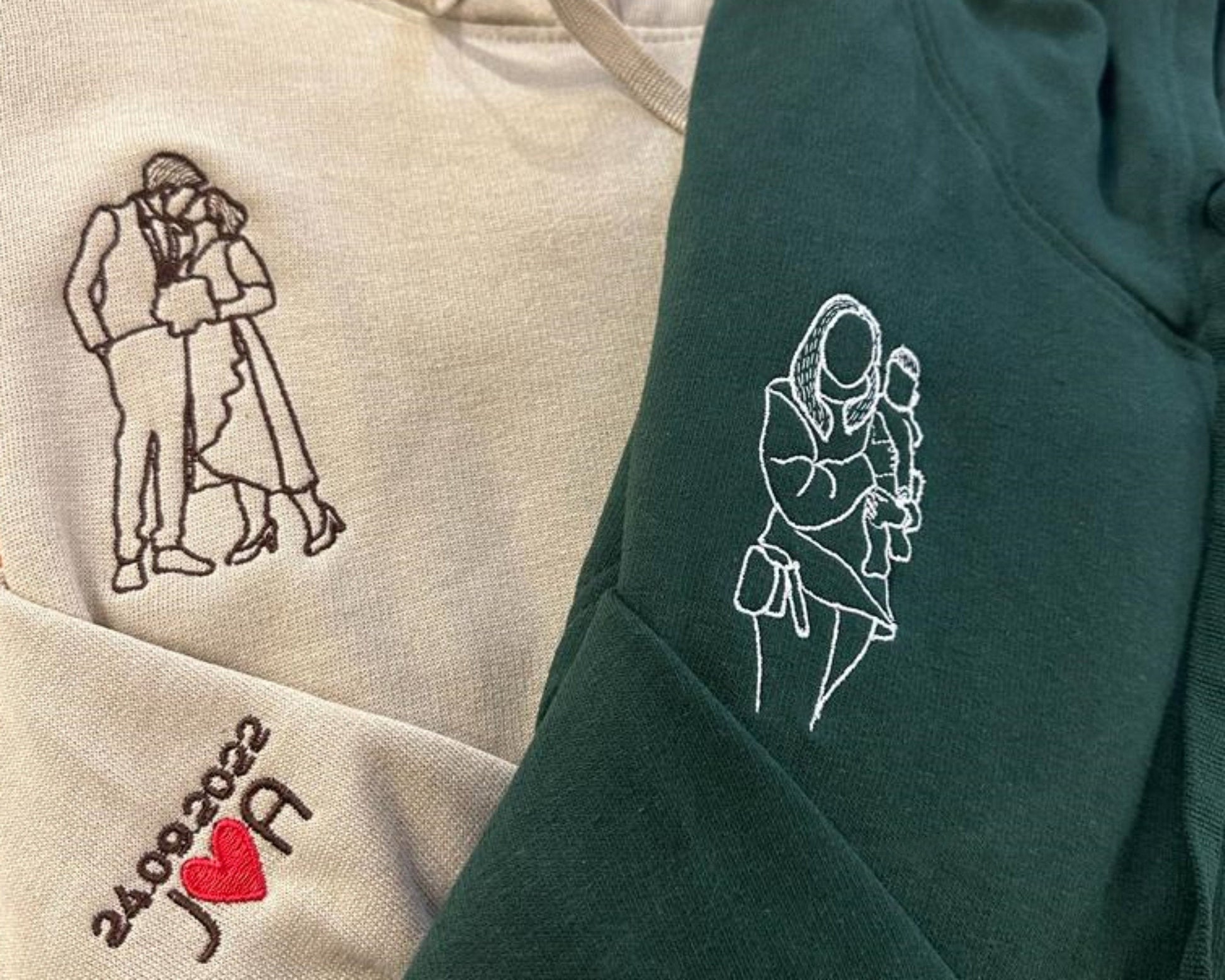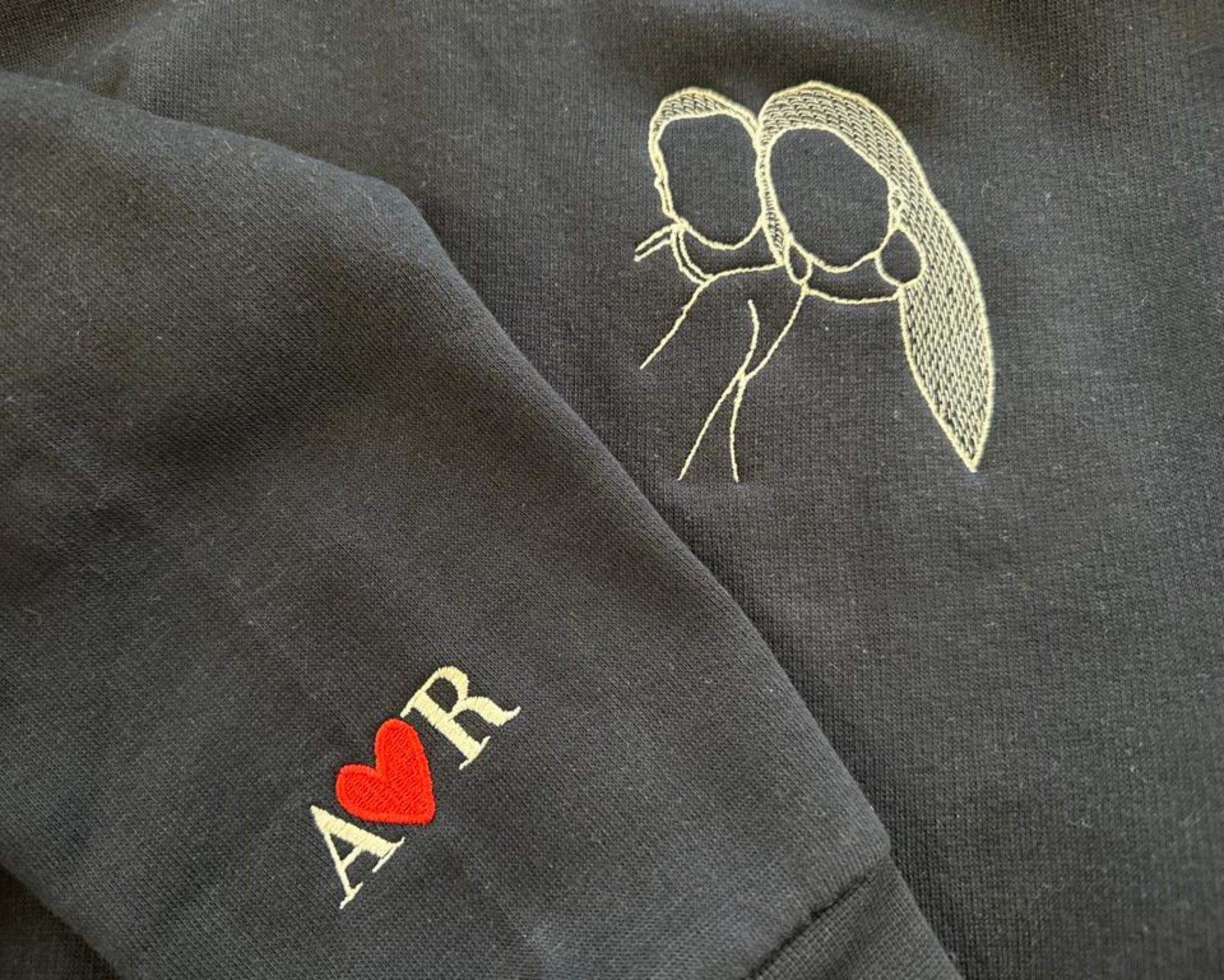 カスタム写真刺繍パーカー、写真からパーソナライズされたカップルのスケッチユニセックスパーカー、1周年記念特別日付イニシャルマッチングジャンパー