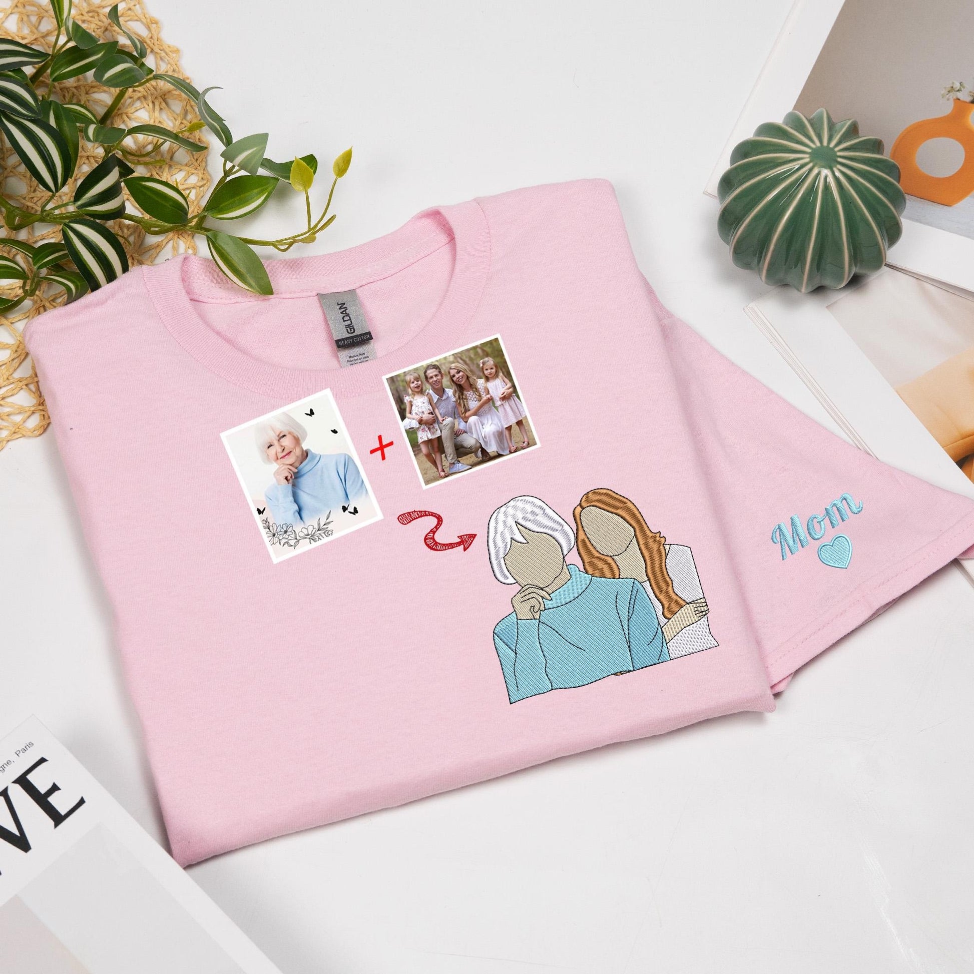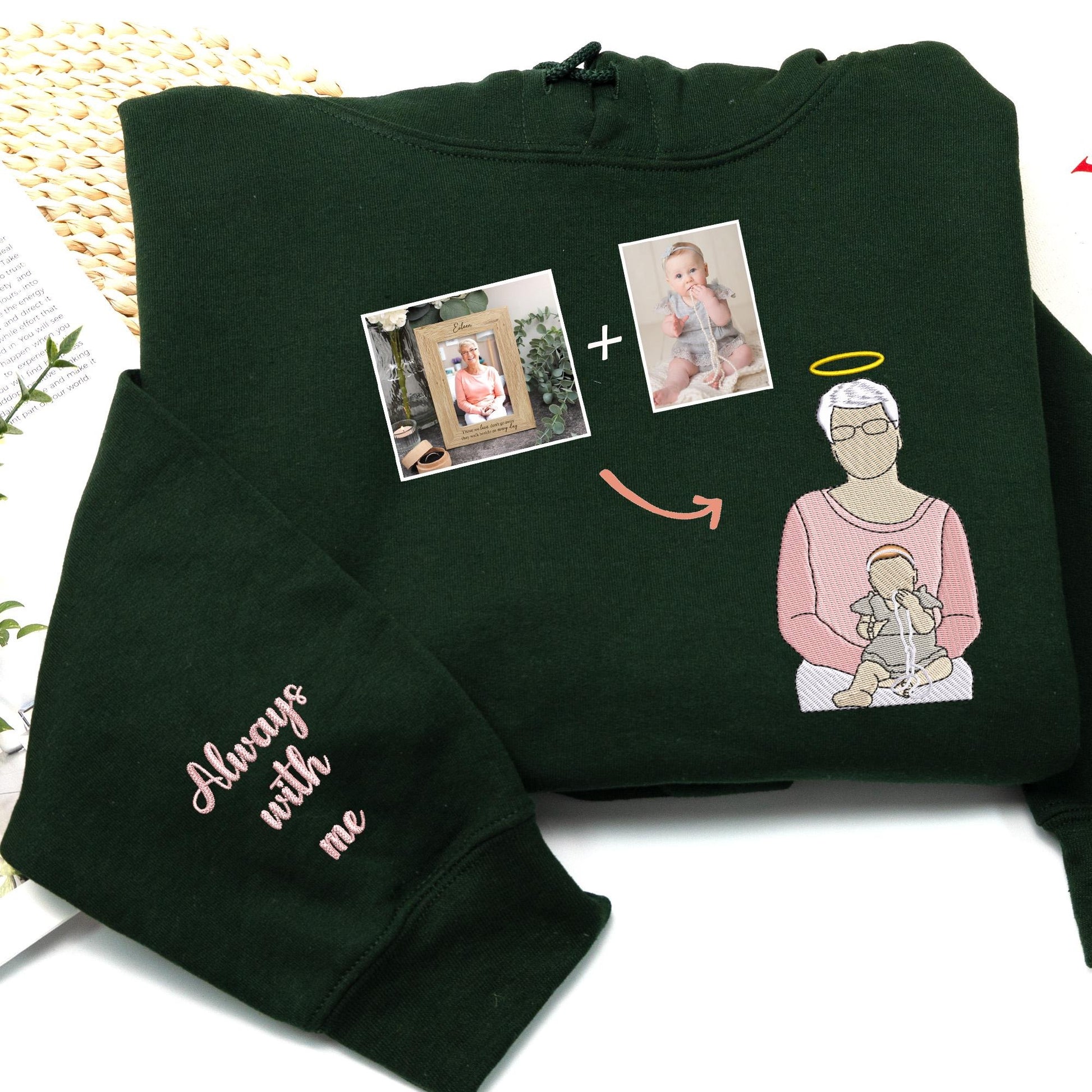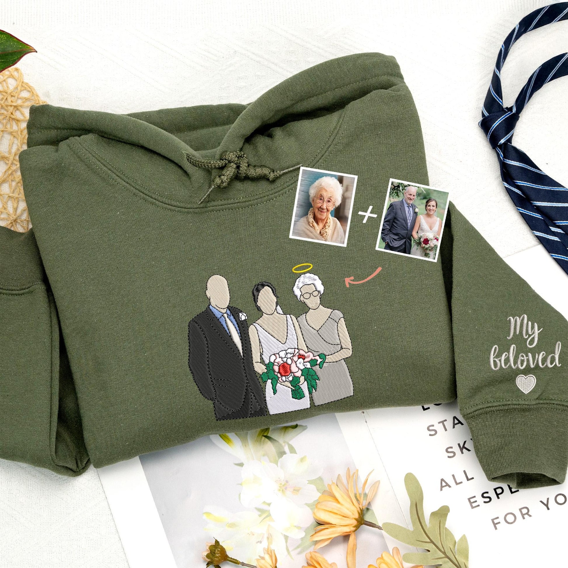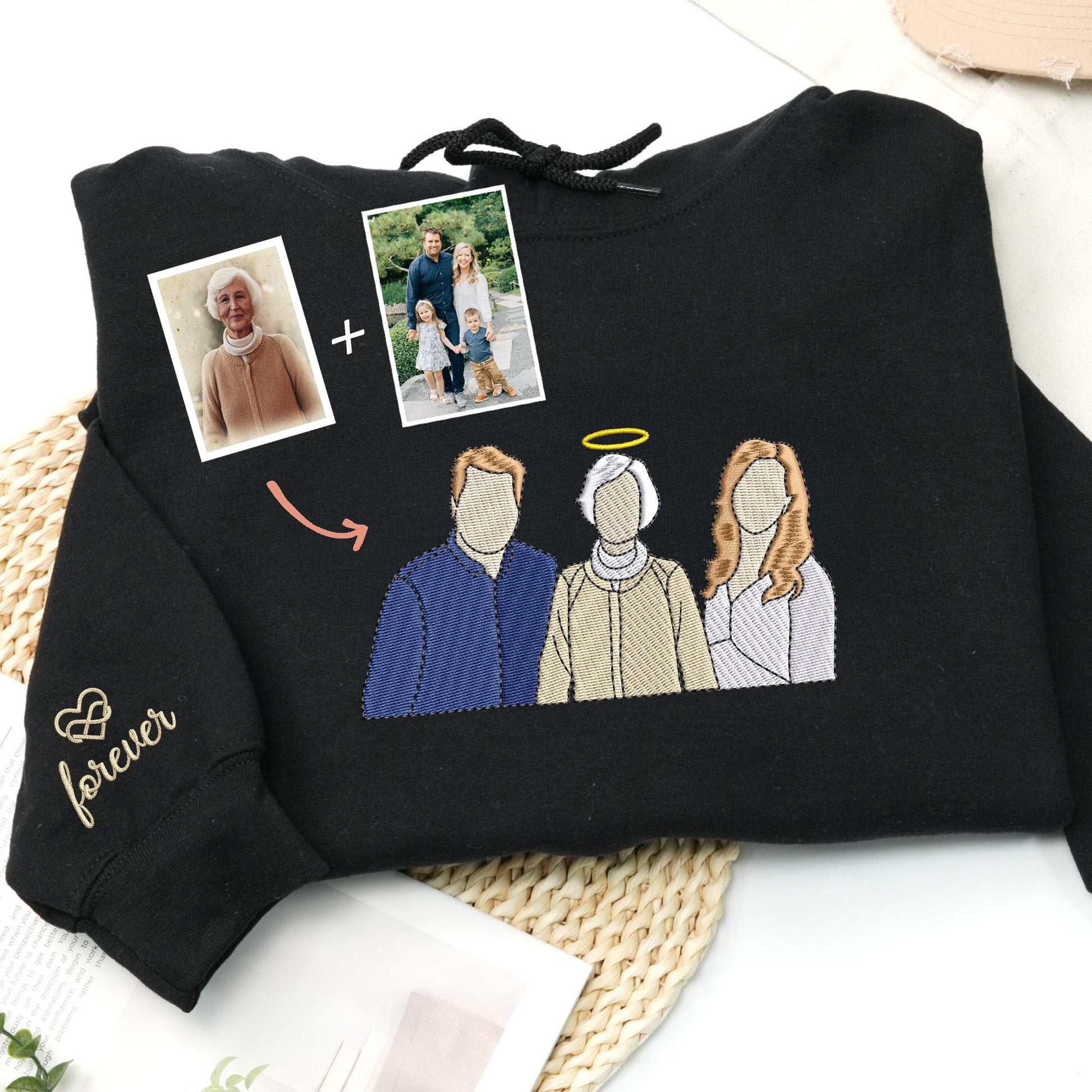2 枚の写真を融合:故人の写真と、あなた(または家族)の写真を 1 つの刺繍デザインに仕上げます。「再会」の瞬間を、服に永遠に残します。